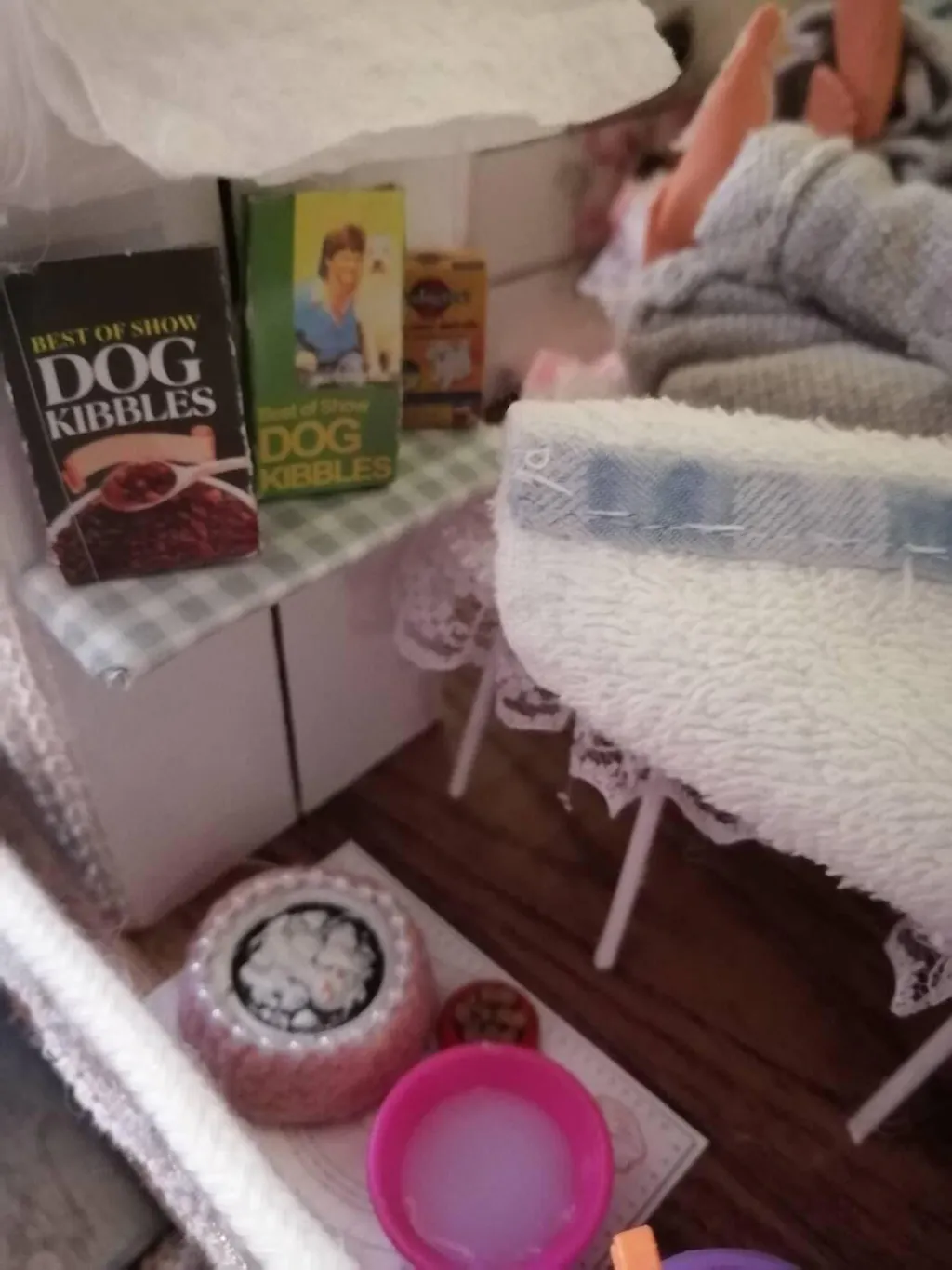 Perfekte Tierfutterpackungen, sogar mit Fressnapf. Endlich genügend Vorrat im Puppenhaus.
