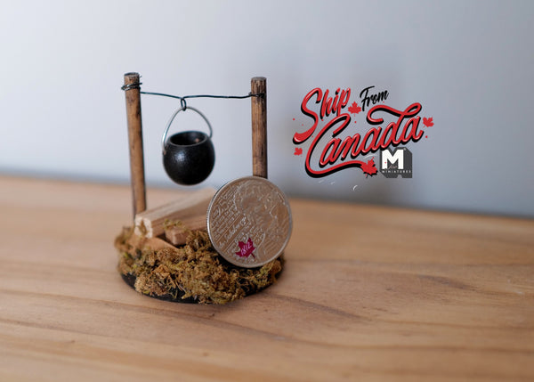 1:12 Dollhouse Supplies garden decoration miniature wood fire pit with fire logs and hanging pot - D086