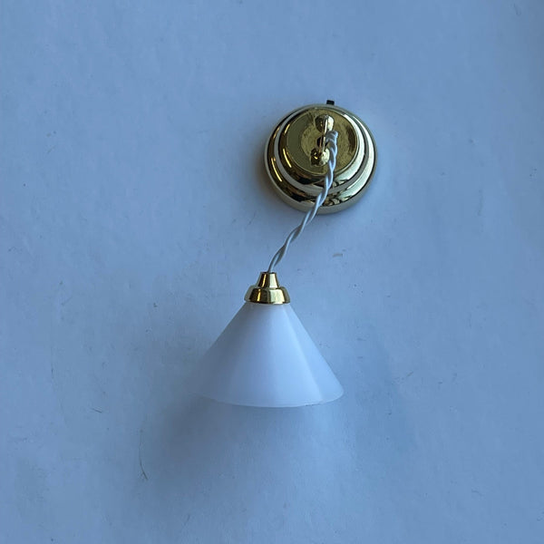This is a battery powered miniature ceiling lamp with a cone shade. For 1 inch scale dollhouse. A reminiscent of classic style restaurant lights!