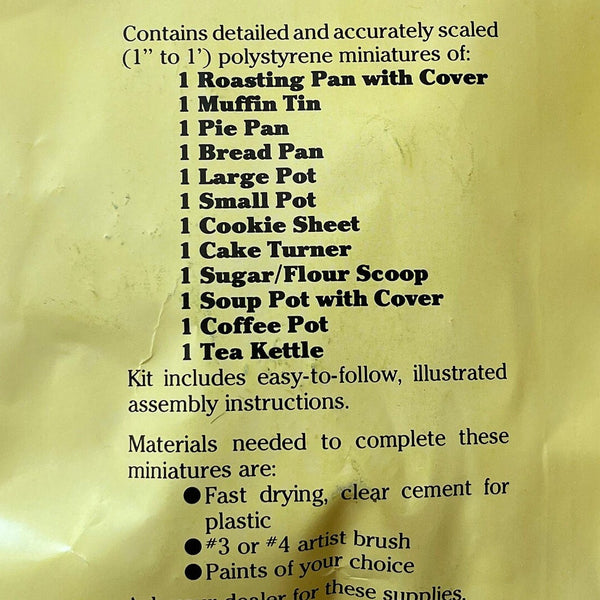 This is a 1 inch scale 14-piece miniature cookware kit. The base color is white and they need to be painted. Accessories in the picture are not included. From Chrysnbon.