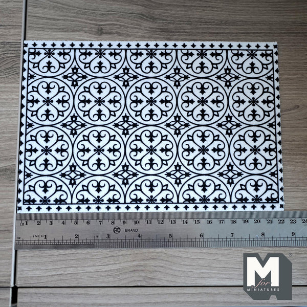 Add a touch of bold elegance to your dollhouse with this miniature printed area rug featuring a black and white tile-inspired pattern. The intricate geometric and floral motifs mimic Mediterranean and Moroccan floor tiles, giving your miniature rooms a sophisticated, timeless look.