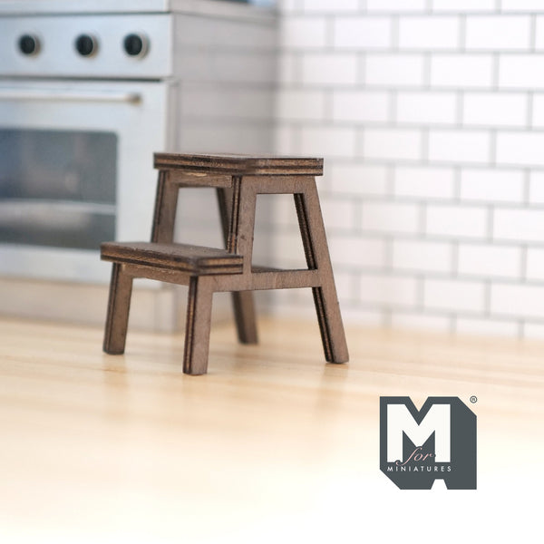 This is a wooden miniature kitchen stool in 1 inch scale.
