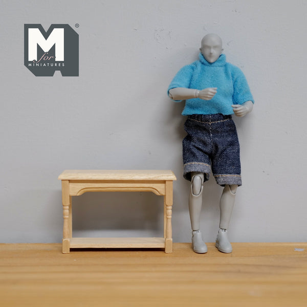 This is an unfinished wooden miniature hall table for a 1 inch scale dollhouse.