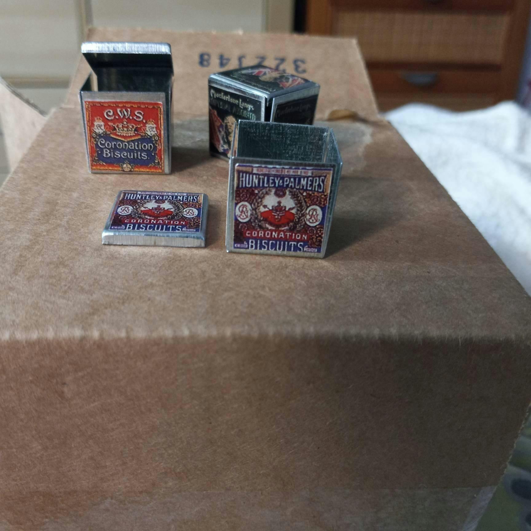 This is a set of 3 miniature biscuit tins in 1 inch scale.