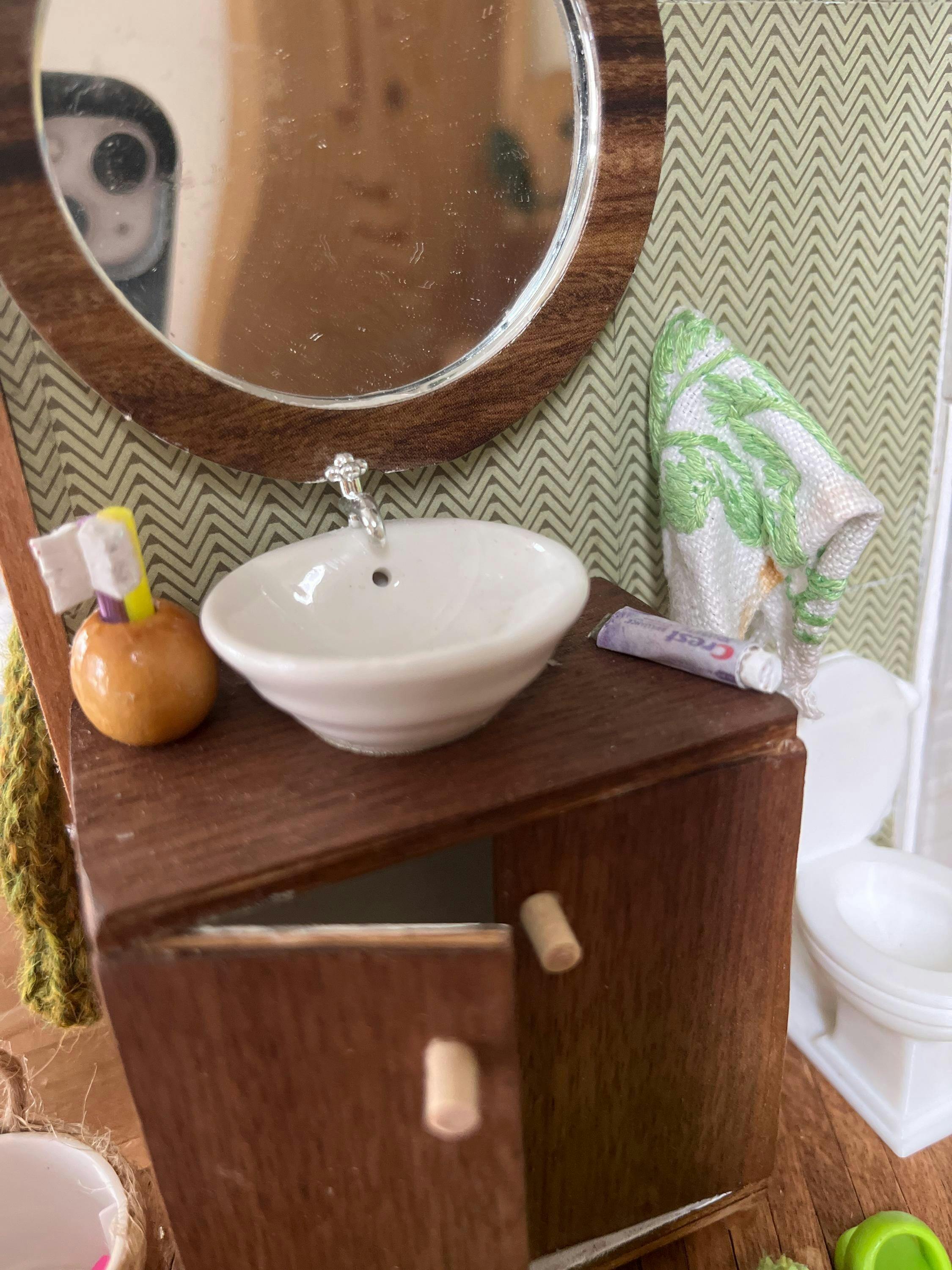 You are viewing a 1:12 Dollhouse miniature ceramic bathroom vessel sink with silver style faucet.