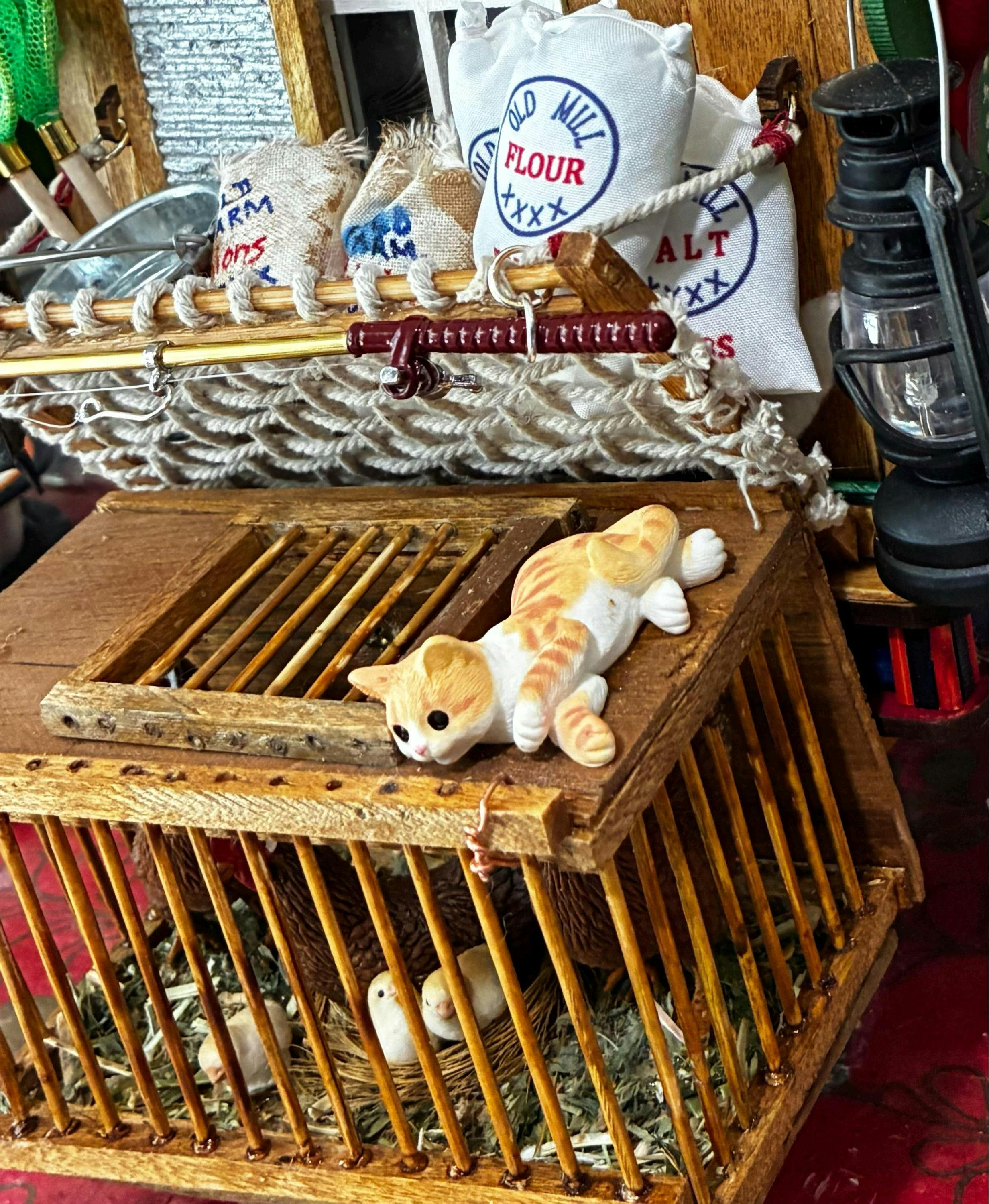 This cat looks just like my late cat. I brought him so I'd always have a piece of Marley in my dollhouse. He's going to forever be on our bench now.
