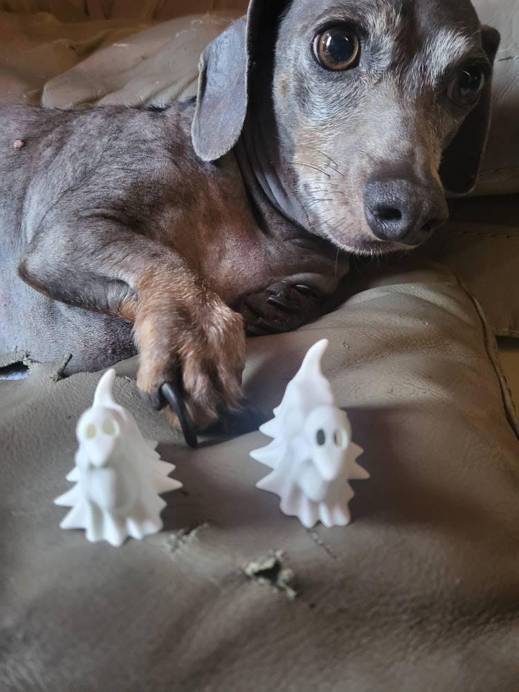 Miniature Draped Ghost Wiener Dog 1:12 Scale Dollhouse Supplies Halloween Creepy Dachshund Spooky Dog 1-1/8 inch tall.