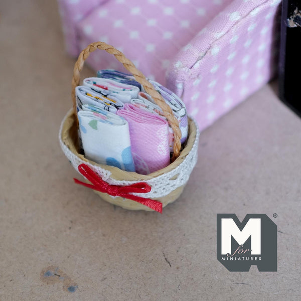 This is a miniature rope basket of linen for a 1 inch scale dollhouse. All linens are fixed to the basket.