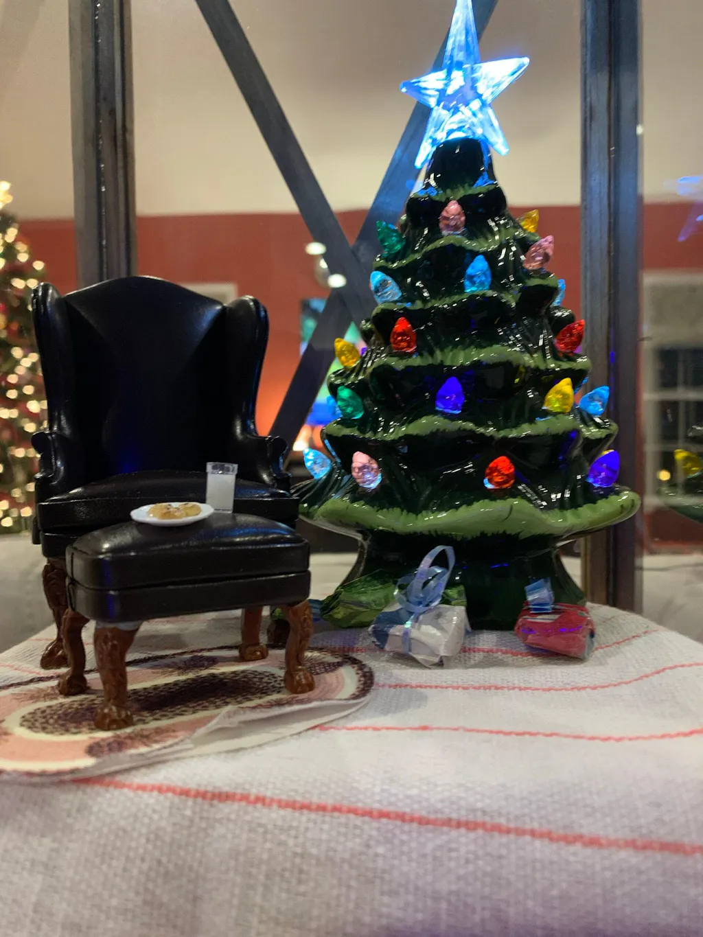 This is a handmade 1:12 brown faux leather armchair with an ottoman / leg stand / foot rest.