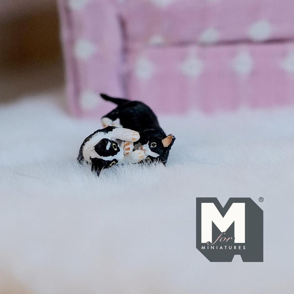 These are 2 miniature black and white kittens playing. All in 1 inch scale.