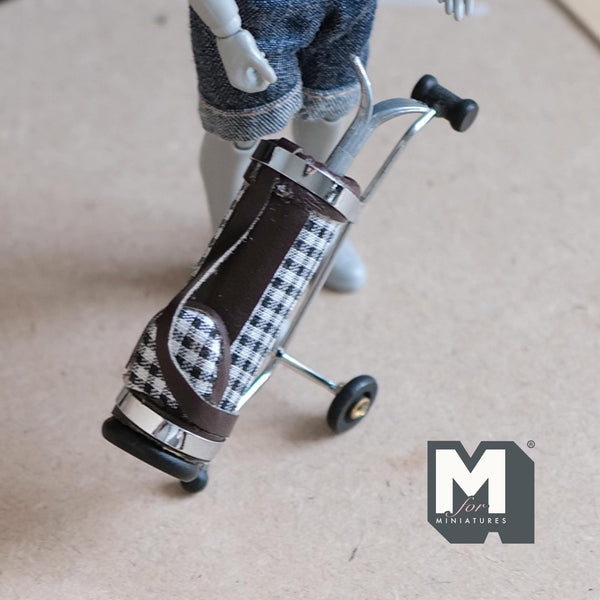 Miniature Golf Bag with Clubs 1:12 Scale Sports Faux Leather Golf Pull Cart Trolley 3-1/4 inch tall (brown) - A092