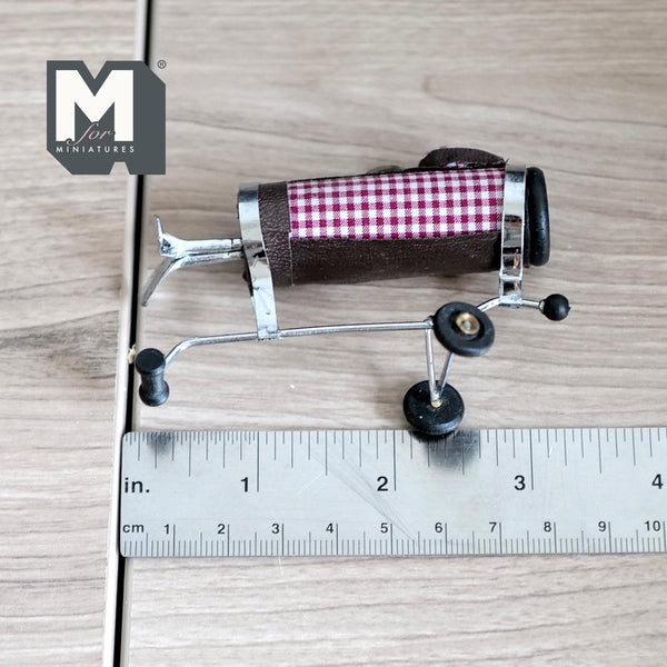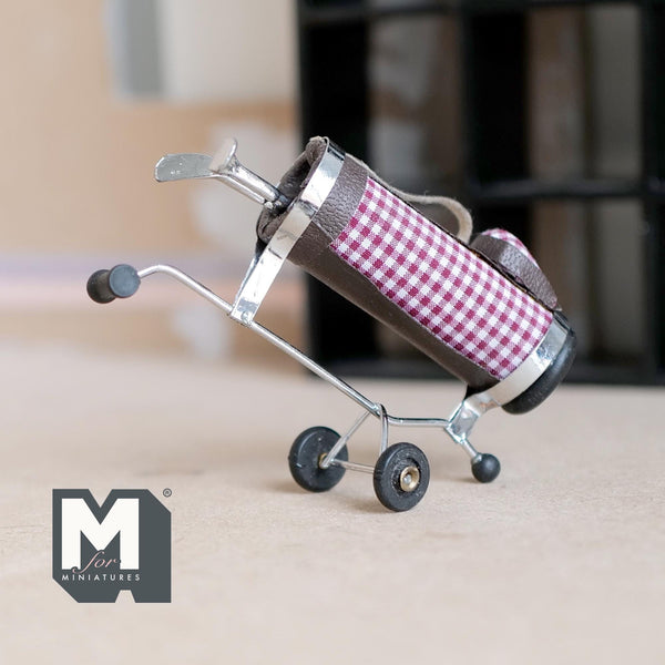 This is a set of miniature golf pull cart, golf bag and 2 golf clubs in 1 inch scale. Note all pieces are fixed together.