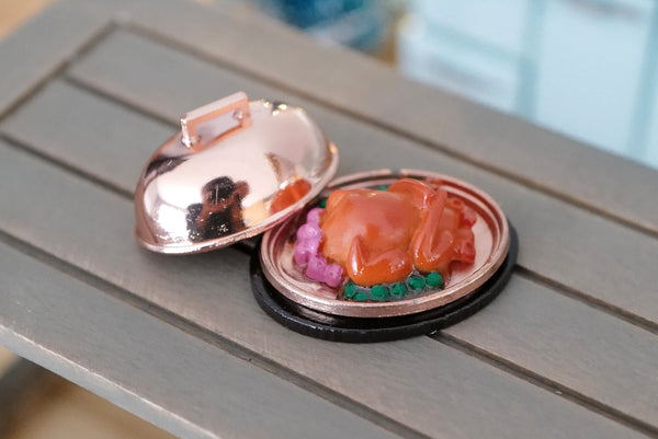 You are viewing a 1:12 dollhouse food decoration miniature Thanksgiving turkey with metal oval serving plate and dome cover lid.