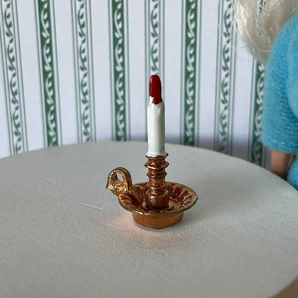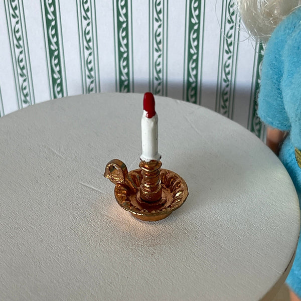 This is a miniature candle and metal holder in 1 inch scale.