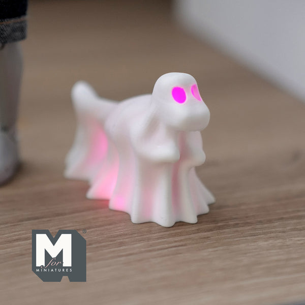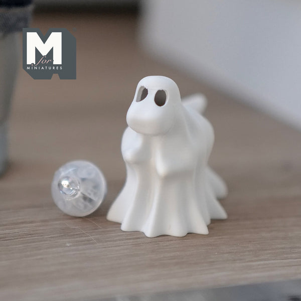 This 1 inch scale miniature draped ghost tyrannosaurus is ready to paint and it also comes with 2 battery powered multi-color micro LED bulbs that you can put into the hollow body. Don't stare at his eyes... he will dance in front of you..... with his short hands.... lol