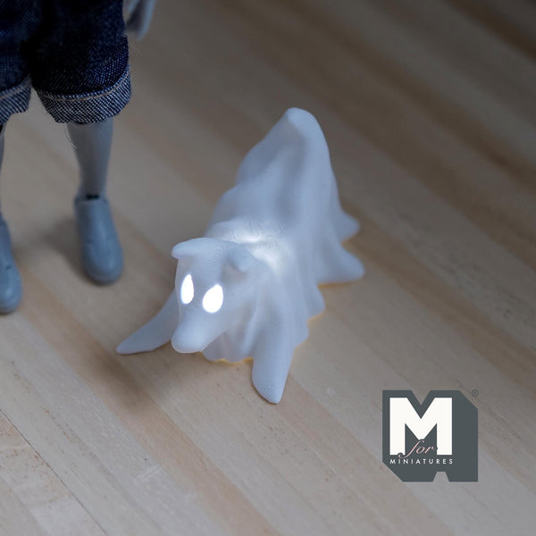 This 1 inch scale miniature draped ghost dog is ready to paint and it also comes with 2 battery powered micro LED bulbs that you can put into the hollow body. Don't stare at his eyes... he is ready to run......