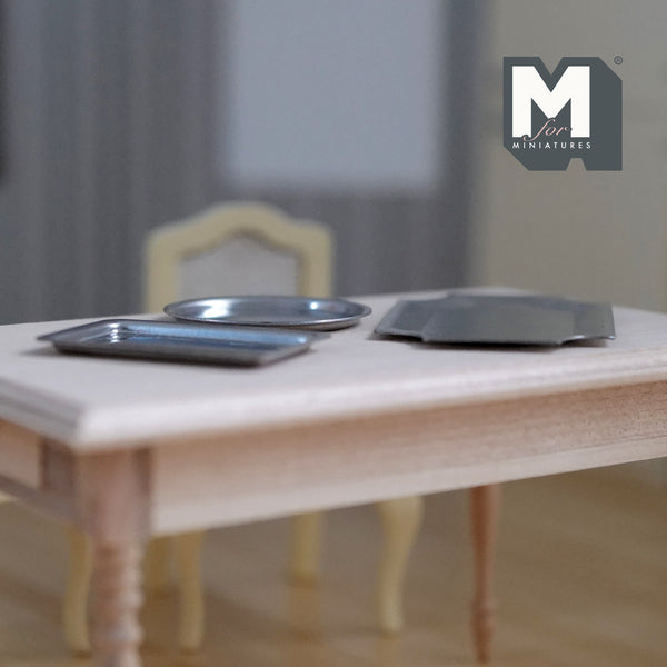 This is a set of 3 miniature aluminum rectangular dining serving trays in 1 inch scale.