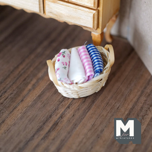 Dollhouse Supplies Basket with Folded Linens , 1 Inch Scale Bamboo Rope Basket of Linen (fabric fixed to basket) - F013